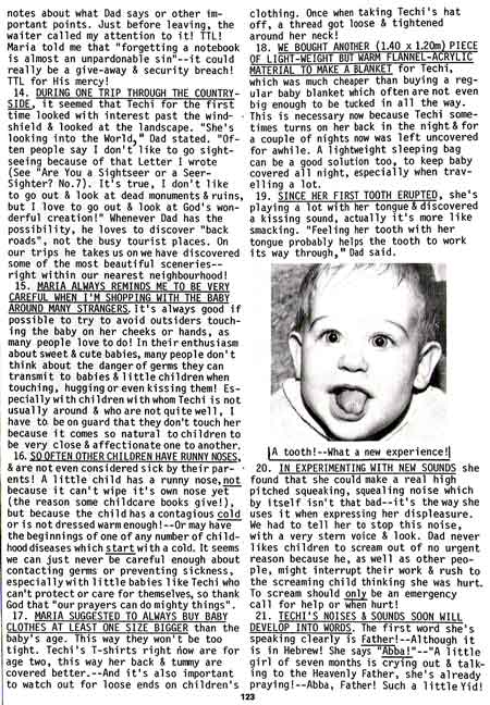 Jesus, altogether she didn't have problems with them & was a real "soldier for the Lord" when her teeth cut through.(When she was 16 months old, her back teeth came through & during this time she was more irritable & it reminded us to give her extra TLC (Tender Loving Care) 8 comfort.) At the age of 1½, she had 16 teeth, TYL! 6. DAVIDITO ALWAYS IS A SPECIAL FRIEND & COMFORTER TO HER & he knows this 8 loves to help his little sister. It's a special day for her when David comes to visit. One day David had his time with Mommy & Daddy who told him a new "Grandpa Story". As soon as Techi saw her big brother, she squealed for joy! She was jumping 8 dancing in her bouncer for awhile, so happy while watching David play with his cars, & Dad joined his children for awhile. How Techi loved to have her two most favourite lovers kneeling at her feet! 7. SHE LOVES DAVID & SHOWS HIM HER APPRECIATION BY LAUGHING & squealing at him & he in return shares his favourite toy cars with her. Davidito is very thoughtful about washing his hands before he plays with baby Techi, just as Maria taught him to do, & he even disinfects his cars by wiping them off with a diluted disinfectant solution, since Techi still puts everything into her mouth. ![]() David & Davida only got to see Techi during visits at that time. 8. ONCE TECHI & I VISITED THE' FAMILY AT THE STAFF HOUSE WHERE SHE SAW RICHARD FOR THE FIRST TIME who had rejoined this team, Before Techi rewards someone with her smiles, she really looks them over first, very soberly, but then she is very generous with her smiles. We stayed at the house for almost two hours before we could see Davidito because he was taking his nap. All that time she must have been missing him because she wasn't as cheerful like she usually is. But then as soon as she saw her beloved big brother, she laughed out loud for joy, reached for him to pat him & without interruption "talked to him, showing off for him all the noises she can make! 9. CHILDREN HAVE A WONDERFUL WAY TO COMMUNICATE & there seems to be a special understanding between them. When being out with Techi on a walk, she soberly takes everything in & shows a fascination for all moving things--dogs, cats, birds, cars, etc. But whenever we pass a child or another baby, Techi smiles at them & is very outgoing towards them! 10. WHEN THE WEATHER HAS BEEN NICE, WE GO OUT FOR OUR DAILY WALK WHICH WE ENJOY VERY MUCH. Facing the direction we walk she "records" everything. "She looks & acts like a Princess, even just sitting in her pram!" Path said. Sometimes we meet Path or Richard or one of the staff for a longer walk which is a real blessing 8 whoever comes along loves to have a turn pushing Techi in the buggy. 11. ONE DAY WE WENT TO THE NEARBY VILLAGE & STOPPED IN A CAFE TO WARM UP, WHEN A VERY SAD-LOOKING WOMAN SAT NEXT TO US. She was pregnant & as if Techi knew, she smiled at the lady 8 cheered her up so that she was so much happier afterwards. A few days later Richard met that lady again while out in town & she cheered up as soon as she saw him! Who knows what Techi's smiles & love towards that lady really changed in her! All our children can affect people so positively! TYJ! 12. SOME TIME AGO, DAD GAVE US SOME VERY HELPFUL INSTRUCTIONS ABOUT GOING ON WALKS WITCH CHILDREN: Normally walk on the side of the road facing the traffic; if the street has a curve, go on the outer side of the curve, where drivers can see you. Dad always prefers that two people go out together. Then, on narrow paths, one person should walk ahead & lead in single file. If it's late in the afternoon, or evening wear something light or white which can be seen better by passing cars,8 purchase a flashlight or special strap-on pedestrian/bicyclist flashlight. We strapped ours onto the pram, or the person walking in front would wear it strapped to their arm. 13. ANOTHER LESSON LEARNED WHILE ON OUTINGS WAS when leaving a restaurant the other day, I left my notebook on the table which I usually carry in my purse to take notes about what Dad says or other important points. Just before leaving, the waiter called my attention to it! TTL! Maria told me that "forgetting a notebook is almost an unpardonable sin"--it could really be a give-away & security breach! TTL for His mercy! 14. DURING ONE TRIP THROUGH THE COUNTRYSIDE, it seemed that Techi for the first time looked with interest past the windshield & looked at the landscape. "She's looking into the World," Dad stated. "Often people say I don't like to go sightseeing because of that Letter I wrote (See "Are You a Sightseer or a Seer-Sighter? No.7). It's true, I don't like to go out & look at dead monuments & ruins, but I love to go out & look at God's wonderful creation!" Whenever Dad has the possibility, he loves to discover "back roads", not the busy tourist places. On our trips he takes us on we have discovered some of the most beautiful sceneries--right within our nearest neighbourhood! 15. MARIA ALWAYS REMINDS ME TO BE VERY CAREFUL WHEN I'M SHOPPING WITH THE BABY AROUND MANY STRANGERS. It's always good if possible to try to avoid outsiders touching the baby on her cheeks or hands, as many people love to do! In their enthusiasm about sweet & cute babies, many people don' t think about the danger of germs they can transmit to babies & little children when touching, hugging or even kissing them! Especially with children with whom Techi is not usually around & who are not quite well, I have to be on guard that they don't touch her because it comes so natural to children to be very close & affectionate one to another. 16. SO OFTEN OTHER CHILDREN HAVE RUNNY NOSES, & are not even considered sick by their parents! A little child has a runny nose, not because it can't wipe it's own nose yet (the reason some childcare books give!), but because the child has a contagious cold or is not dressed warm enough !--0r may have the beginnings of one of any number of childhood diseases which start with a cold. It seems we can
