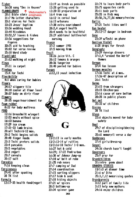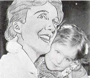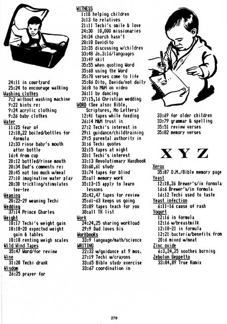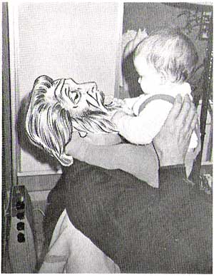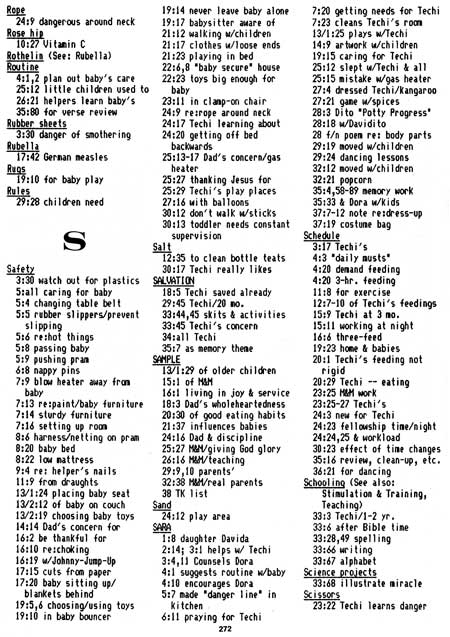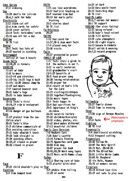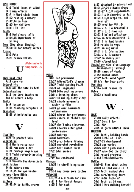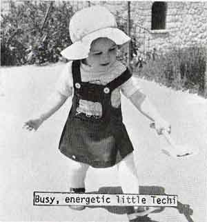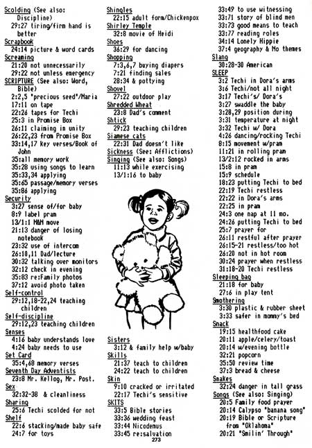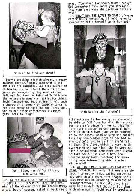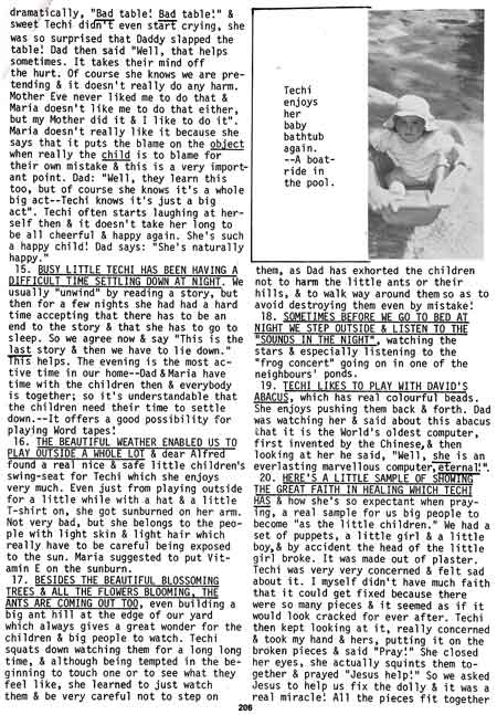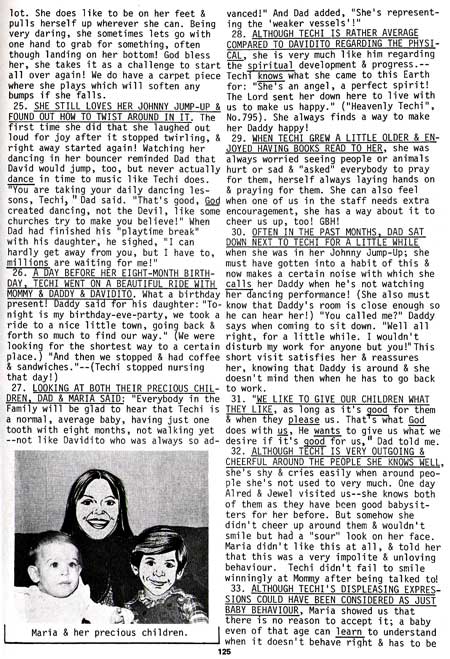 Maria & her precious children And Dad added, "She's representing the 'weaker vessels'!" 28. ALTHOUGH TECHI IS RATHER AVERAGE COMPARED TO DAVIDITO REGARDING THE PHYSICAL, she is very much like him regarding the spiritual development & progress.--Techi knows what she came to this Earth for: "She's an angel, a perfect spirit! The Lord sent her down here to live with us to make us happy." ("Heavenly Techi", No.795). She always finds a way to make her Daddy happy! 29. WHEN TECHI GREW A LITTLE OLDER & ENJOYED HAVING BOOKS READ TO HER, she was always worried seeing people or animals hurt or sad & "asked" everybody to pray for them, herself always laying hands on & praying for them. She can also feel when one of us in the staff needs extra encouragement, she has a way about it to cheer us up, too! GBH! 30. OFTEN IN THE PAST MONTHS, DAD SAT DOWN NEXT TO TECHI FOR A LITTLE WHILE when she was in her Johnny Jump-Up; she must have gotten into a habit of this & now makes a certain noise with which she calls her Daddy when he's not watching her dancing performance! (She also must know that Daddy's room is close enough so he can hear her!) "You called me?" Daddy says when coming to sit down. "Well all right, for a little while. I wouldn't disturb my work for anyone but you!” This short visit satisfies her & reassures her, knowing that Daddy is around & she doesn't mind then when he has to go back to work. 31. "WE LIKE TO GIVE OUR CHILDREN WHAT THEY LIKE, as long as it's good for them & when they please us. That s what God does with us, He wants to give us what we desire if it's good for us," Dad told me. 32. ALTHOUGH TECHI IS VERY OUTGOING & CHEERFUL AROUND THE PEOPLE SHE KNOWS WELL, she's shy & cries easily when around people she's not used to very much. One day Alred & Jewel visited us--she knows both of them as they have been good babysitters for her before. But somehow she didn't cheer up around them & wouldn't smile but had a "sour" look on her face. Maria didn't like this at all, & told her that this was a very impolite & unloving behaviour. Techi didn't fail to smile winningly at Mommy after being talked to! 33. ALTHOUGH TECHI'S DISPLEASING EXPRESSIONS COULD HAVE BEEN CONSIDERED AS JUST BABY BEHAVIOUR, Maria showed us that there is no reason to accept it; a baby even of that age can learn to understand when it doesn't behave right & has to be Techi's Life Story - pg. 206 - 209