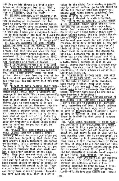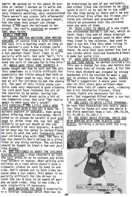 them, as Dad has exhorted the children not to harm the little ants or their hills, & to walk way around them so as to avoid destroying them even by mistake! 18. SOMETIMES BEFORE WE GO TO BED AT NIGHT WE STEP OUTSIDE & LISTEN TO THE "SOUNDS IN THE NIGHT", watching the stars & especially listening to the "frog concert" going on in one of the neighbours' ponds. 19. TECHI LIKES TO PLAY WITH DAVID'S ABACUS, which has real colourful beads. She enjoys pushing them back & forth. Dad was watching her & said about this abacus that it is the World's oldest computer, first invented by the Chinese, & then looking at her he said, "Well, she is an everlasting marvellous computer, eternal!". 20. HERE'S A LITTLE SAMPLE OF SHOWING THE GREAT FAITH IN HEALING WHICH TECHI HAS & how she's so expectant when praying, a real sample for us big people to become "as the little children." We had a set of puppets, a little girl & a little boy, & by accident the head of the little girl broke. It was made out of plaster. Techi was very very concerned & felt sad about it. I myself didn't have much faith that it could get fixed because there were so many pieces & it seemed as if it would look cracked for ever after. Techi then kept looking at it, really concerned & took my hand & hers, putting it on the broken pieces & said "Pray!" She closed her eyes, she actually squints them together & prayed "Jesus help!" So we asked Jesus to help us fix the dolly & it was a real miracle! All the pieces fit together again! We worked on it for about 20 minutes or rather I worked on it while she was just watching, sitting next to me, very intensly watching, very concentrated! There weren't any cracks left afterwards! It showed me how much her prayers meant, how she knew that prayer can change things & how much she believed in her prayer. She really expected an answer! GBH! What faith! [JEWELS FROM DAD] 21. TECHI HAD FUN WATCHING SARA MAKING POPCORN, of course from a safe distance. Dad says it's a healthy snack as long as the weather's cool & the kitchen could use the heat from preparing it! It's not a hot weather food! Techi likes it especially with salt. Dad said "Well, it's better for her than sweets & she seems to need the salt if she asks for it like this!" 22. MARIA GAVE TECHI SOME CHERRIES & Daddy taught her how to spit out the pit. This sometimes is a little difficult for especially the little ones, & Dad told us that Dr. Koger used to say, that it's not bad at all for children to eat the cherry pit. The peel of this little stone contains some very important & good vitamins. The Lord must have intended the pit of the cherries to be eaten. During Communion when Techi drank quite a bit of the Communion wine, Dad said "She really wants to make sure she's saved!" 23. ESPECIALLY OUR little girls here LIKE TO PLAY WITH A TEA SET & make imaginary popcorn or pancakes, then going about offering them to everybody. Maria asked us to please be careful & just pre tend to drink from the cup but not actually to put our mouth on the cup which wouldn't be very hygienic, & would be an easy way for germs to spread. Pleas be sure to wash tea sets frequently when your children play with them, tea sets & any toy utensils don't belong on a dirty floor or any dirty surface. The children should be taught to treat a tea-set just like dishes! 24. DAD CAUTIONED US ABOUT THE CHILDREN PLAYING OUTSIDE,--they shouldn't go into the ta11 grass, so as to prevent any bites from spiders or snakes. When walking with children on a road which doesn't have a sidewalk, please be sure to keep to one side. Don't spread out to both sides because when a car comes, this makes it especially difficult for the driver to steer the car & have to be aware of people on both sides. Stay to one side, & walk single-file if necessary. 25. WHEN WATCHING THE NEWS & especially in a foreign language which then has to be translated by one of our nationals, Dad either likes the children to be very quiet & still or to not be in the room for the time being so there won't be any distraction! Also often the TV news pictures are violent and gruesome and it should be prevented that the children even see most of them. 26. TECHI LIKES TO DRESS UP & one night she discovered Davida's sun hat, which on Techi looks like one of these tropical hats the English people used to wear when they lived in the colonies. Dad used to wear a sun hat like this when living in Florida & Texas, since it's very hot there. He said that once mother Eve had a sun stroke which involved headache & fever & made her quite sick. 27. WHEN SOON AFTER RICHARD CAME & JOINED OUR TEAM AGAIN, he worked outside a lot. This was a change for him, who before had been doing lots of inside work, & for the first days Richard was plagued by strong headaches till he started to wear a sun hat to protect him from the heat, thanks to "Dad's suggestion! A whole year later now--as this story gets written—dear Alfred does lots of camera work, videoing Dad & his Revelation Classes. Since strong lights are necessary for this work, Dad suggested Alfred wear a sun hat & sun glasses while filming. 28. DAD LOVES TO WATCH LITTLE SPARROWS. He says that those birds are really amazing. They're found all over the World & the Bible mentions them a lot. (Mt.10:29, 31; Ps.84:3, Ps. 102:7.) 29. ONE NIGHT WHILE PLAYING, DAVID HAD BEEN WORKING WITH SOME PLASTIC LEGO BLOCKS, building a palace with the king ![]() sitting on his throne & a little play broom as his scepter. Dad said, "Well, he's a humble king. He's using a broom for his scepter. Good for him!" 30. WE WERE WATCHING A TV PROGRAM with classical music. It showed a man playing the mandolin, an instrument that Dad used to play, very similar to the banjo. The artist wasn't very inspiring looking & Dad wished, "It would be so much nicer if they would have girls swaying & dancing to this music!" Dad said he played the mandolin when he was on a boat ride in the moonlight with a pretty girl. Happy girl! 31. DAD W