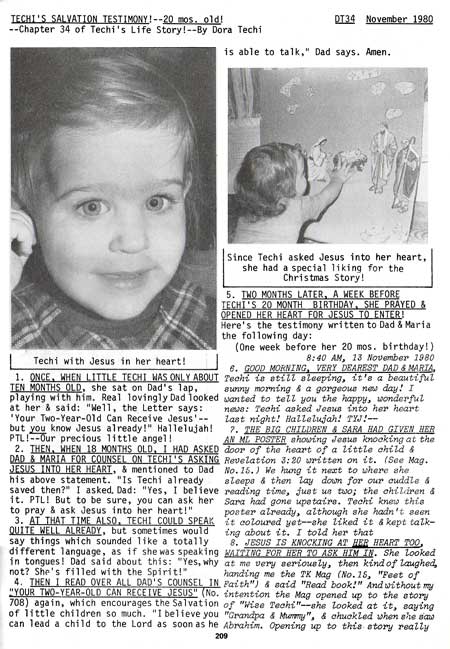 ![]() Techi with Jesus in her heart! 1. ONCE, WHEN LITTLE TECHI HAS ONLY ABOUT TEN MONTHS OLD, she sat on Dad's lap, playing with him. Real lovingly Dad looked at her & said: "Well, the Letter says: 'Your Two-Year-01d Can Receive Jesus'--but you know Jesus already!" Hallelujah! PTL!--0ur precious little angel! 2. THEN, WHEN 18 MONTHS OLD, I HAD ASKED DAD & MARIA FOR COUNSEL ON TECHI'S ASKING JESUS INTO HER HEART, & mentioned to Dad his above statement. "Is Techi already saved then?" I asked. Dad: "Yes, I believe it. PTL! But to be sure, you can ask her to pray & ask Jesus into her heart!" 3. AT THAT TIME ALSO, TECHI COULD SPEAK QUITE WELL ALREADY, but sometimes would say things which sounded like a totally different language, as if she was speaking in tongues! Dad said about this: "Yes, why not? She's filled with the Spirit!" 4. THEN I READ OVER ALL DAD'S COUNSEL IN "YOUR TWO-YEAR-OLD CAN RECEIVE JESUS" (No. 708) again, which encourages the Salvation of little children so much. "I believe you can lead a child to the Lord as soon as he is able to talk," Dad says. Amen. ![]() Since Techi asked Jesus into her heart, she had a special liking for the Christmas Story! 5. TWO MONTHS LATER, A WEEK BEFORE TECHI'S 20 MONTH BIRTHDAY, SHE PRAYED & OPENED HER HEART FOR JESUS TO ENTER! Here's the testimony written to Dad & Maria the following day: (One week before her 20 mos. birthday!) 8:40 AM, 13 November 1980 S. GOOD MORNING! VERY DEAREST DAD & MARIA, Techi. is stilt sleeping,, -it's a beautiful sunny morning & a gorgeous new day.' I wanted to tell you the happy, wonderful news: Techi asked Jesus into her heart last night! Hallelujah! TYJ!-- 7. THE BIG CHILDREN S SABA HAD GIVEN HER AN ML POSTER showing Jesus knocking at the door of the heart of a little child 8 Revelation 3:20 written on it. (See Mag. No.15.) We hung it next to where she sleeps S then lay down for our cuddle & reading time, just us two; the children & Sara had gone upstairs. Techi knew this poster already, although she hadn't seen it coloured yet—she liked it & kept talking about it. I told her that 8. JESUS IS KNOCKING AT HER HEART TOO, WAITING FOR HER TO ASK HIM IN. She looked at me very seriously, then kind of laughed, handing me the TK Mag (No.I5, "Feet of Faith") & said "Read book!" And without my intention the Mag opened up to the story of "Wise Techi"--she looked at it, saying "Grandpa & Mummy", & chuckled when she saw Abrahim. Opening up to this story really Techi's Life Story - pg. 226 - 241