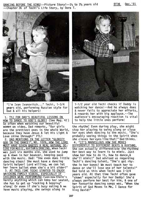 ![]() "I'm Ivan Ivanovitch..." Techi, 1-3/4 years old, performing Russian style for Dad & all his helpers! 1. TYJ FOR DAD'S BEAUTIFUL LESSONS ON HOW TO DANCE TO GOD'S GLORY! (See Mag. 42) So often when watching our beautiful women on video, Dad remarks, "Our girls are the prettiest ones in the whole World, because they have Jesus & let His Light & Love shine through!" PTL! 2. DAD MENTIONS IN THE LETTER "GLORIFY GOD IN THE DANCE!". NO. 1026, HOW THE LORD MUST HAVE GIVEN BABIES A REAL NATURAL DESIRE FOR MUSIC, RHYTHM & DANCING. When Techi was just six months old, she used to jump up & down in her bouncer, keeping pace with the music. Dad: "She even does little dancing steps! She must have a dancing Spirit helper! Lord willing, we can let her learn ballet when she's a bit older!" 3. AT THIS TIME TECHI STARTED TO ENJOY WATCHING FAMILY VIDEOS. ESPECIALLY IF CHILDREN WERE PERFORMING! Even now there's hardly anything which can keep her seated, she has to get up "rocking & bopping" along! Or even if she's busy eating & we have music playing, she swings along in ![]() 1-1/2 year old Techi checks if Daddy is watching her dance!--And he always does & never fails to appreciate her efforts, & rewards her with big applause.--The audience's encouraging reaction is vital to help the little ones perform! the rhythm! Even during play, she might stop her playing to swing along or close her eyes when dancing to the music. "She's probably seeing things in the Spirit when she closes her eyes 1ike that!" Dad thinks. 4. "IT'S MARVELLOUS HOW SHE MOVES DIFFERENTLY TO DIFFERENT BEATS & RHYTHMS. She can actually differentiate the rhythms! Her best way to learn is to mimic. Just show her how to do it, how to dance, & she'll mimic!" Dad advised us regarding Techi's dancing talent, "She's got rhythm in her bones! We must teach her to dance or she'll lose one of her talents!" Dad told us this when Techi was 1-3/4 years old. At that time Techi often gave "shows" especially for her Daddy! She'd always perform her best for him, & one of her favourite dancing songs was, "When the Spirit of God Moves in Me, I Dance for King David!" ![]() Inspiration time! Techi (1½) & Peter A. ![]() "London Bridge" with Grandpa! 5. DAD TO TECHI: "YOU WONDER GIRL! --That's what I'll call you! Oh what a wonder that she loves me!" PTL! And to us, Dad said, "You've got a handful, a handful of responsibility, a handful of talent who really needs a coach!" TYJ! 6. SO. WHEN TECHI WAS ONE YEAR & 10 MONTHS OLD. WE STARTED DAILY SHORT LESSONS teaching Techi, Davida (nearly 5), & David (6) about rhythm. We mainly practiced dancing steps with the two girls, while David learned to play the guitar, which he progressed in so well that soon he even could support the background music for the girls' performances! 7. NOW, AS THIS CHAPTER IS WRITTEN. TECHI IS 2 YEARS 9 MONTHS OLD & it is rewarding & inspiring to see how much she has learned over these past months of faithful teaching, GBH! From the beginning, Dad reminded us, "Keep it fun--not work . He said, "She's quite an ingenious natural dancer, so don't regiment her style too much. Teach her steps & routines when she's in the mood, but then let her dance her own. way when so inspired. I think the group dancing--follow-the-leader--wi11 help her with routines, as she likes to mimic." So this was the key: Mimic! 8. SO HERE ARE SOME DANCING & VIDEOING TIPS WHICH SARA & 1 COLLECTED SOON AFTER WE TAUGHT THE GIRLS about simple dancing steps , rhythm & appreciation for music. Since our children can't go out witnessing & perform for others, all the video-shows we've taken of the children turned into our "witnessing shows" for Grandpa & Maria. Many of these tips might not pertain to you, since your children have live performing sessions with a great audience to witness to, God bless them! Nevertheless, we'd like to share with you things we've learned about dancing & videoing children's shows. (We'd never taught dancing before!) They are all live shows too--one-take shots! [TIPS ON TEACHING DANCING!] 9. OUR FIRST DANCE RECITAL WAS ACTUALLY AFTER ONLY FIVE DAYS of simple dance practice. The songs were short simple "Tiny tot" songs taken from a System record that just had very basic movements, i.e. flying your arms like a bird, swinging arms like you're painting with a paintbrush, squatting up & down, hopping & even waving scarves to a swaying movement. These songs were not specifically about Jesus, but they did turn their key as a beginning attempt since they were all new songs to the children & simple to "dance" to! 10. WE FOUND THAT LITTLE SIMPLE PROPS REALLY ENCOURAGED THE GIRLS TO TRY HARD TO LOOK THEIR BEST: Pretty scarves to ![]() The children took turns introducing the show, with date & their ages. "My name is Techi & I'm 2 years old." Sometimes we had them hold a sign with the date & place written on it. ![]() A present from Grandpa! The next day we used it as a prop in our video show. wave & swing in the air with rhythm movements, little berets for French painters, as well as hand-made colourful pallets for a painting song, kittycat ears on their hairbands for a song about feeding a kitten & pretty little umbrellas for songs about raindrops. 11. IN LATER SHOWS WE HAD LIGHTWEIGHT BAGS FOR THEM TO SWING OVFR THEIR SHOULDERS for "Brave Pioneers", roses to dance with for ballet, homemade stick horses for a cowboy song of "Land of Not Too Much", earrings, scarves, turbans & lots of jewelry & scarf-skirts for a Bahama song, "Everybody Can Be Happy!" For "Holy Holes" we made two big round circles ![]() Our Bahama girl! A tangerine as a reward for a good performance! from cardboard & covered them in aluminium foil to try to emphasise a message as we danced. This is something we've tried to impress on the girls, that they're dancing as a witness & doing it for the Lord! 12. AS FAR AS TEACHING BASIC DANCING MOVEMENTS WE FOUND THE SIMPLER THE BETTER IN EVERY WAY! The very basics begin of course with knowing your righ