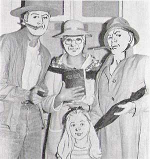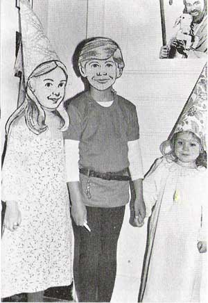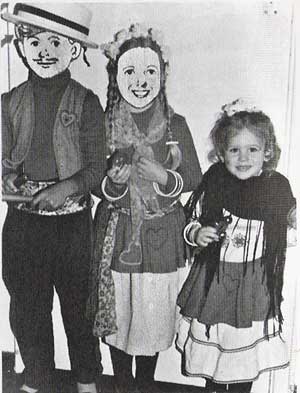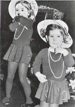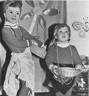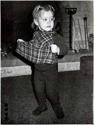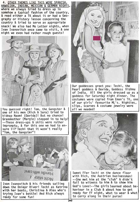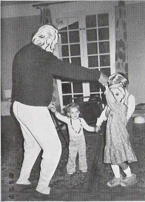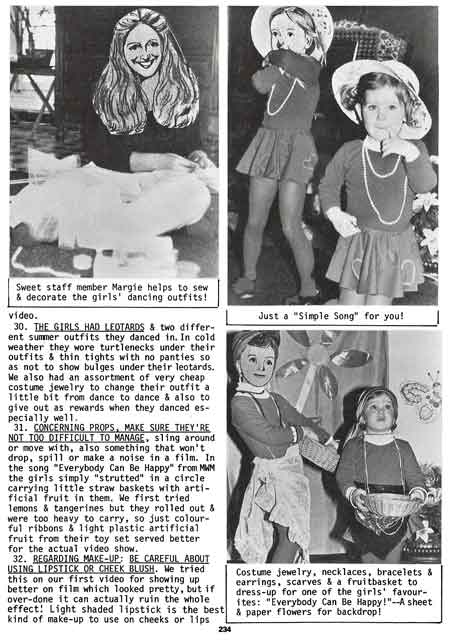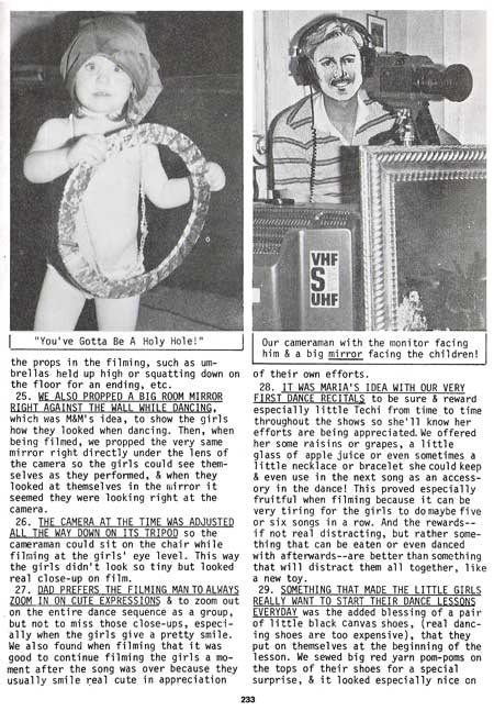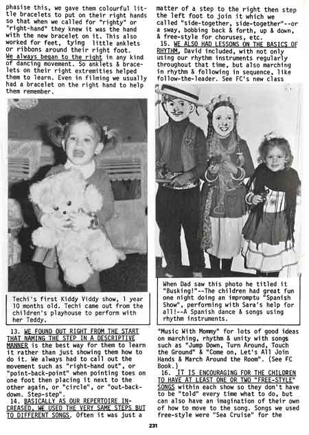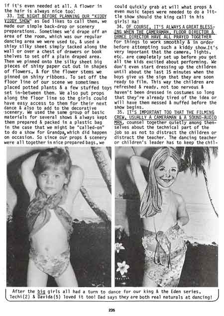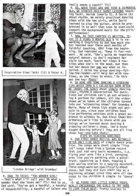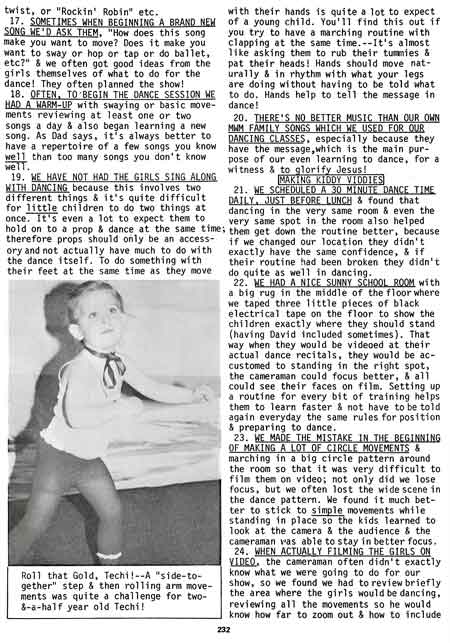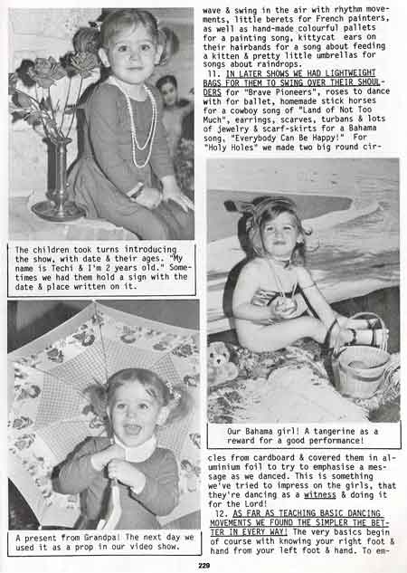 phasise this, we gave them colourful little bracelets to put on their right hands so that when we called for "righty" or "right-hand" they knew it was the hand with the new bracelet on it. This also worked for feet, tying little anklets or ribbons around their right foot. We always began to the right in any kind of dancing movement. So anklets & bracelets on their right extremities helped them to learn. Even in filming we usually had a bracelet on the right hand to help them remember. ![]() Techi's first Kiddy Viddy show, 1 year 10 months old. Techi came out from the children's playhouse to perform with her Teddy. 13. WE FOUND OUT RIGHT FROM THE START THAT NAMING THE STEP IN A DESCRIPTIVE MANNER is the best way for them to learn it rather than just showing them how to do it. We always had to call out the movement such as "right-hand out", or "point-back-point" when pointing toes on one foot then placing it next to the other again, or "circle", or "out-back-down. Step-step". 14. BASICALLY AS OUR REPERTOIRE INCREASED. WE USED THE VERY SAME STEPS BUT TO DIFFERENT SONGS. Often it was just a matter of a step to the right then step the left foot to join it which we called "side-together, side-together"--or a sway, bobbing back & forth, up & down, S free-style for choruses, etc. 15. WE ALSO HAD LESSONS ON THE BASICS OF RHYTHM. David included, with not only using our rhythm instruments regularly throughout that time, but also marching in rhythm & following in sequence, like follow-the-leader. See FC's new class ![]() When Dad saw this photo he titled it "Busking!"--The children had great fun one night doing an impromptu "Spanish Show", performing with Sara's help for all!—-A Spanish dance & songs using rhythm instruments. "Music With Mommy" for lots of good ideas on marching, rhythm & unity with songs such as "Jump Down, Turn Around, Touch the Ground" & "Come on, Let's All Join Hands & March Around the Room". (See FC Book.) 16. IT IS ENCOURAGING FOR THE CHILDREN TO HAVE AT LEAST ONE OR TWO "FREE-STYLE" SONGS within each show so they don't have to be "told" every time what to do, but can also have an imagination of their own of how to move to the song. Songs we used free-style were "Sea Cruise" for the twist, or "Rockin1 Robin" etc. 17. SOMETIMES WHEN BEGINNING A BRAND NEW SONG WE'D ASK THEM. "How does this song make you want to move? Does it make you want to sway or hop or tap or do ballet, etc?" & we often got good ideas from the girls themselves of what to do for the dance! They often planned the show! 18. OFTEN. TO BEGIN THE DANCE SESSION WE HAD A WARM-UP with swaying or basic movements reviewing at least one or two songs a day & also began learning a new song. As Dad says, it's always better to have a repertoire of a few songs you know well than too many songs you don't know well. 19. WE HAVE NOT HAD THE GIRLS SING ALONG WITH DANCING because this involves two different things & it's quite difficult for 1ittle children to do two things at once. It's even a lot to expect them to hold on to a prop & dance at the same time; therefore props should only be an accessory and not actually have much to do with the dance itself. To do something with their feet at the same time as they move ![]() Roll that Gold, Techi!--A "side-together" step & then rolling arm movements was quite a challenge for two-&-a-half year old Techi! with their hands is quite a lot to expect of a young child. You'll find this out if you try to have a marching routine with clapping at the same time.--It's almost like asking them to rub their tummies & pat their heads! Hands should move naturally & in rhythm with what your legs are doing without having to be told what to do. Hands help to tell the message in dance! 20. THERE'S NO BETTER MUSIC THAN OUR OWN MWM FAMILY SONGS WHICH WE USED FOR OUR DANCING CLASSES, especially because they have the message, which is the main purpose of our even learning to dance, for a witness & to glorify Jesus! [MAKING KIDDY VIDDIES] 21. WE SCHEDULED A 30 MINUTE DANCE TIME DAILY. JUST BEFORE LUNCH & found that dancing in the very same room & even the very same spot in the room also helped them get down the routine better, because if we changed our location they didn't exactly have the same confidence, & if their routine had been broken they didn't do quite as well in dancing. 22. WE HAD A NICE SUNNY SCHOOL ROOM with a big rug in the middle of the floor where we taped three little pieces of black electrical tape on the floor to show the children exactly where they should stand (having David included sometimes). That way when they would be videoed at their actual dance recitals, they would be accustomed to standing in the right spot, the cameraman could focus better, & all could see their faces on film. Setting up a routine for every bit of training helps them to learn faster & not have to be told again everyday the same rules for position & preparing to dance. 23. WE MADE THE MISTAKE IN THE BEGINNING OF MAKING A LOT OF CIRCLE MOVEMENTS & marching in a big circle pattern around the room so that it was very difficult to film them on video; not only did we lose focus, but we often lost the wide scene in the dance pattern. We found it much better to stick to simple movements while standing in place so the kids learned to look at the camera & the audience 8 the cameraman was able to stay in better focus. 24. WHEN ACTUALLY FILMING THE GIRLS ON VIDEO, the cameraman often didn't exactly know what we were going to do for our show, so we found we had to review briefly the area where the girls would be dancing, reviewing all the movements so he would know how far to zoom out & how to include ![]() "You've Gotta Be A Holy Hole!" the props in the filming, such as umbrellas held up high or squatting down on the floor for an ending, etc. 25. WE ALSO PROPPED A BIG ROOM MIRROR RIGHT AGAINST THE WALL WHILE DANCING, which was M&M's idea, to show the girls how they looked when dancing. Then, when being filmed, we proppe