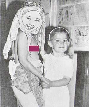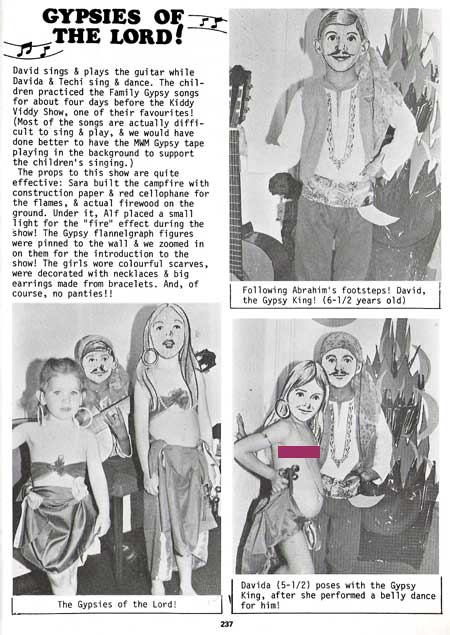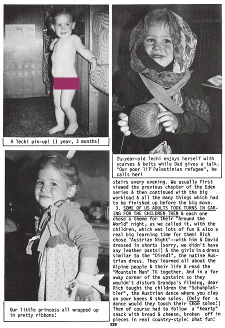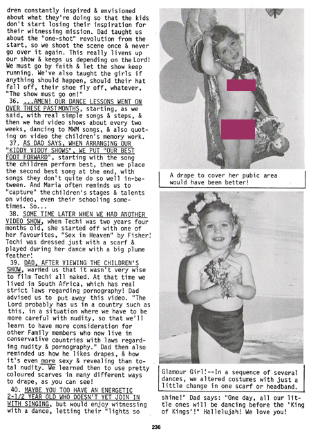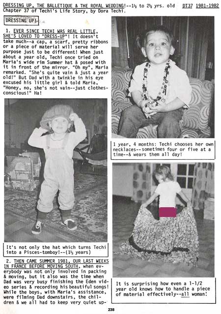 dren constantly inspired & envisioned about what they're doing so that the kids don't start losing their inspiration for their witnessing mission. Dad taught us about the "one-shot" revolution from the start, so we shoot the scene once & never go over it again. This really livens up our show & keeps us depending on the Lord! We must go by faith & let the show keep running. We've also taught the girls if anything should happen, should their hat fell off, their shoe fly off, whatever, "The show must go on!" 36. ...AMEN! OUR DANCE LESSONS WENT ON OVER THESE PASTMONTHS, starting, as we said, with real simple songs & steps, & then we had video shows about every two weeks, dancing to MWM songs, & also quoting on video the children's memory work. 37. AS DAD SAYS, WHEN ARRANGING OUR "KIDDY VIDDY SHOWS", WE PUT "OUR BEST FOOT FORWARD", starting with the song the children perform best, then we place the second best song at the end, with songs they don't quite do so well in-between. And Maria often reminds us to "capture" the children's stages & talents on video, even their schooling sometimes. So... 38. SOME TIME LATER WHEN WE HAD ANOTHER VIDEO SHOW, when Techi was two years four months old, she started off with one of her favourites, "Sex in Heaven" by Fisher! Techi was dressed just with a scarf & played during her dance with a big plume feather! 39. DAD, AFTER VIEWING THE CHILDREN'S SHOW, warded us that it wasn't very wise to film Techi all naked. At that time we lived in South Africa, which has real strict laws regarding pornography! Dad advised us to put away this video. "The Lord probably has us in a country such as this, in a situation where we have to be more careful with nudity, so that we'll learn to have more consideration for other Family members who now live in conservative countries with laws regarding nudity & pornography." Dad then also reminded us how he likes drapes, & how it's even more sexy & revealing than total nudity. We learned then to use pretty coloured scarves in many different ways to drape, as you can see! 40. MAYBE YOU TOO HAVE AN ENERGETIC 2-1/2 YEAR OLD WHO DOESN'T YET JOIN IN WITH SINGING, but would enjoy witnessing with a dance, letting their "lights so ![]() A drape to cover her pubic area would have been better! ![]() Glamour Girl!—In a sequence of several dances, we altered costumes with just a little change in one scarf or headband. shine!" Dad says: "One day, all our little ones will be dancing before the 'King of Kings'!" Hallelujah! We love you! ![]() David sings & plays the guitar while Davida & Techi sing & dance. The children practiced the Family Gypsy songs for about four days before the Kiddy Viddy Show, one of their favourites! (Most of the songs are actually difficult to sing & play, & we would have done better to have the MWM Gypsy tape playing in the background to support the children's singing.) The props to this show are quite effective: Sara built the campfire with construction paper & red cellophane for the flames, & actual firewood on the ground. Under it, Alf placed a small light for the "fire" effect during the show! The Gypsy flannelgraph figures were pinned to the wall & we zoomed in on them for the introduction to the show! The girls wore colourful scarves, were decorated with necklaces & big earrings made from bracelets. And, of course, no panties!! ![]() Following Abrahim's footsteps! David, the Gypsy King! (6-1/2 years old) ![]() The Gypsies of the Lord! ![]() Davida (5-1/2) poses with the Gypsy King, after she performed a belly dance for him! DRESSING UP, THE BALLETIQUE & THE ROYAL WEDDING!—-1½ to 2½ yrs. old DT37 1981-1982 Chapter 37 of Techi's Life Story, by Dora Techi. [DRESSING UP] 1. EVER SINCE TECHI WAS REAL LITTLE. SHE'S LOVED TO "DRESS-UP"! It doesn't take much--a cap, a scarf, pretty ribbons or a piece of material will serve her purpose just to be different! When just about a year old, Techi once tried on Maria's wide rim Summer hat & posed with it in front of the mirror. "Oh my", Maria remarked. "She's quite vain & just a year old!" But Dad with a twinkle in his eye excused his little girl & told Maria, "Honey, no, she's not vain--just clothes-conscious!" Ha! ![]() It's not only the hat which turns Techi into a Pisces-tomboy!--(l½ years) 2. THEN CAME SUMMER 1981, OUR LAST WEEKS IN FRANCE BEFORE MOVING SOUTH, when everybody was not only involved in packing & moving, but it also was the time when Dad was very busy finishing the Eden video series & recording his beautiful songs! While the boys, with Maria's assistance, were filming Dad downstairs, the children & we all had to keep very quiet up ![]() 1 year, 4 months: Techi chooses her own necklaces--sometimes four or five at a time--& wears them all day! ![]() It is surprising how even a 1-1/2 year old knows how to handle a piece of material effectively—all woman! ![]() A Techi pin-up! (1 year, 3 months) ![]() Our little princess all wrapped up in pretty ribbons! ![]() 2½--year-old Techi enjoys herself with scarves & belts while Dad gives a talk. "Our poor lil' Palestinian refugee", he calls her! stairs every evening. We usually first viewed the previous chapter of the Eden series & then continued with the big workload & all the many things which had to be finished up before the big move. 3. SOME OF US ADULTS TOOK TURNS IN CARING FOR THE CHILDREN THEN & each one chose a theme for their "Around the World" night, as we called it, with the children, which was lots of fun & also a real big learning time for them! Rich chose "Austrian Night"--with him & David dressed in shorts (sorry, we didn't have any leather pants!) & the girls in a dress similar to the "Dirndl", the native Austrian dress. They learned all about the Alpine people & their life & read the "Mountain Man" TK together. And in a far away corner of the upstairs so they wouldn't disturb Grandpa's filming, dear Rich taught the children the "Schuhplattler", the Austrian dance where you clap on your knees & shoe s