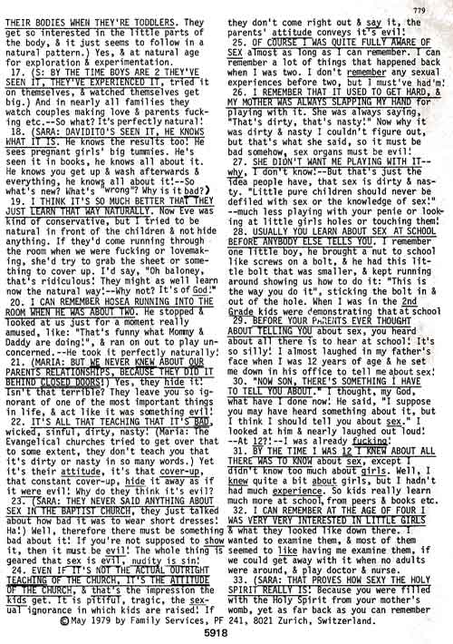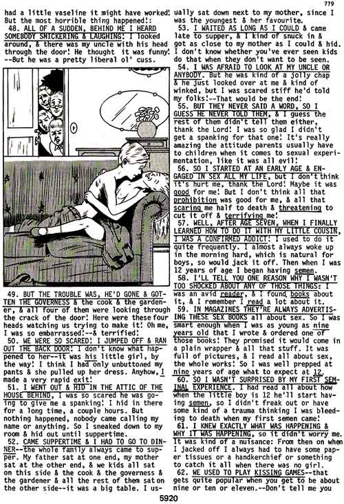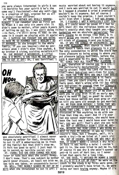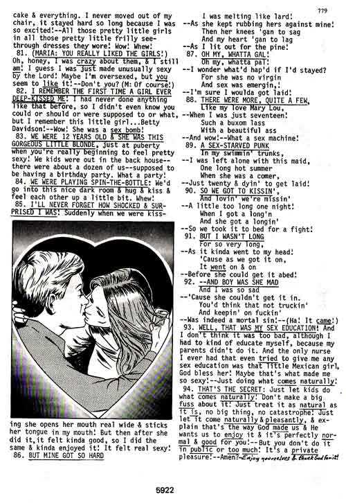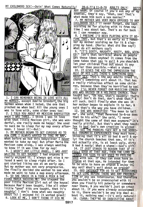![]() 2 I TOLD YOU ABOUT MY MEXICAN BABY-SITTER WHEN I WAS THREE. I think I was in love with that little Mexican girl, she was wonderful, she really made me happy! She used to suck me to sleep for my nap every afternoon. I loved it!--But!: 3 MY MOTHER BEGAN TO GET CURIOUS AS TO HOW COME I ALWAYS WANTED TO TAKE MY NAP, when before I had this baby-sitter I never wanted to take my nap! But after Maria the Mexican came along I was always wanting to know if it was time for my nap! 4 I WASN'T ANY LITTLE ANGEL I WAS JUST WAITING TO GET SUCKED! I had orgasms and I really enjoyed it. I always got nice and relaxed and went to sleep right after. So I got started liking sex at an early age. But my mother was not very progressive. She finally decided she wanted to see what made me want to take a nap every afternoon. 5 SO SHE SNUCK IN AND TOOK A PEAK AND SHE FOUND MARIA SUCKING ME! She slapped the poor little Mexican girl out of the house! Because Mom'd been taught, like all other little "good" kids are taught, that it's naughty! I don't know what was naughty about it? I enjoyed it! it worked great! 6 LOOK AT ME, I DON'T THINK IT DID ME ANY HARM! Of course if you'd ask any of my enemies they'd say, "Ahah, see! That's what made him such a sex maniac!" 7 MY MOTHER WAS VERY MUCH OPPOSED TO ANY CHILDHOOD SEX! I'll never forget, she kept scolding me for playing with it from the time I was about two. That's as far back as I can remember now. 8 I PRESUME I'D BEEN PLAYING WITH IT BEFORE THAT, but that's as early as I can remember my mother scolding me for it and slapping my hand. (Maria: What did she say?) What do all mothers say: 9 "IT'S DIRTY, NAUGHTY, NASTY, BAD, WICKED!" Isn't that terrible? Where do people get those ideas anyway? I comes from the same taboo that sex is evil and you shouldn't let your children find out about it any earlier than possible.--what a shame! 10 IT GIVES THE KID THE IMPRESSION THE REST OF HIS LIFE THERE'S SOMETHING EVIL ABOUT SEX! That's the way adults treat it, there's something evil about it. That has a really ridiculous effect on some children, because then they're horrified by sex! 11 I'LL NEVER FORGET OUR MUSICIAN COREEN WHO WAS RAISED IN A HOLINESS CHURCH. They taught her, "Oh now, that's naughty, that's nasty! Don't do that, don't show that!" & all such. Until finally when she was 14 her mother began to explain it to her, and she said that's the way you have children. 12 SHE WAS HORRIFIED! "You mean to tell me", she said, "that Reverend So & So does that to his wife!" She said, "I never thought the same of that man anymore!" It's really pitiful. But that's the way they teach: Sex is bad! God's own creation is wicked! 13 SEE THE PHOBIAS THEY GET AND THE AWFUL TRAUMATIC EXPERIENCES they must have, thinking that it's all so bad and evil and ugly. The church teaches that sex, if it's not actually sin, is at least ugly dirty and bad and nasty! What a shame!--God's gift! 14 IT JUST STANDS TO REASON THAT IF IT FEELS GOOD A T THAT AGE, THEN THE LORD INTENDED FOR KIDS TO GET USED TO FEELING GOOD with sex. If they can have an orgasm at that age, He intended for them to have an orgasm & enjoy it! Why not? What's evil about an orgasm? 15 GOD INTENDED FOR US TO GET ACCUSTOMED TO SEX LONG BEFORE THERE WAS ANY PROCREATION or any sex or intercourse. And therefore you wouldn't be so preoccupied with it when you finally hit puberty or somewhere near there, and you wouldn't just go crazy about it. If you were already accustomed to it, there wouldn't be any big deal about it, nothing new!-- It's only natural! 16 (THEY'RE SO INQUISITIVE ABOUT THEIR BODIES WHEN THEY'RE TODDLERS. They get so interested in the little parts of the body, and it just seems to follow in a natural pattern.) Yes, and at a natural age for exploration and experimentation. 17 (S: BY THE TIME THE BOYS ARE TWO THEY'VE SEEN IT, THEY'VE EXPERIENCED IT, tried it on themselves and watched themselves get big.) And in nearly all families they watch couples making love and Parents fucking etc.--So what? It's perfectly natural! 18 (SARA: DAVIDITO'S SEEN IT, HE KNOWS WHAT IT IS. He knows the results too! He sees pregnant girls' big tummies. He's seen it in books, he knows all about it. He knows you get up and wash afterwards & everything, he knows all about it!--So what's new? What's "wrong"? Why is it bad?) 19 I THINK IT'S SO MUCH BETTER THAT THEY JUST LEARN THAT WAY NATURALLY. Now Eve was kind of conservative, but I tried to natural in front of the children & not hide anything. If they'd come running through the room when we were fucking or lovemaking, she'd try to grab the sheet or something to cover up. I'd say, "Oh balony, that's ridiculous! They might as well learn now the natural way!--Why not? It's of God!" 20 I CAN REMEMBER HOSEA RUNNING IN TO THE ROOM WHEN HE WAS ABOUT TWO. He stopped and looked at us just for a moment really amused, like; "That's funny what Mommy and Daddy are doing!", & ran out to play unconcerned.--He took it perfectly naturally! 21 (MARIA: BUT WE NEVER KNEW ABOUT OUR PARENTS RELATIONSHIPS, BECAUSE THEY DID IT BEHIND CLOSED DOORS!) Yes, they hide it! Isn't that terrible? they leave you so ignorant of one of the most important things in life & act like it was something evil! 22 IT'S ALL THAT TEACHING THAT IT'S BAD, wicked, sinful, dirty, nasty! (Maria: The Evangelical churches tried to get over that to some extent, they don't teach you that it's dirty or nasty in so many words.) Yet it's their attitude, it's that cover-up, that constant cover-up, hide it away as if it were evil! Why do they think it's evil? 23 (SARA: THEY NEVER SAID ANYTHING ABOUT SEX IN THE BAPTIST CHURCH, they just talked about how bad it was to wear short dresses! Ha!) Well, therefore there must be something bad about it! If you're not supposed to show it, then it must be evil! The whole thing is geared that sex is evil, nudity is sin! 24 EVEN IF IT'S NOT THE OUTRIGHT TEACHING OF THE CHURCH, IT'S THE ATTITUDE OF THE CHURCH, & that's 