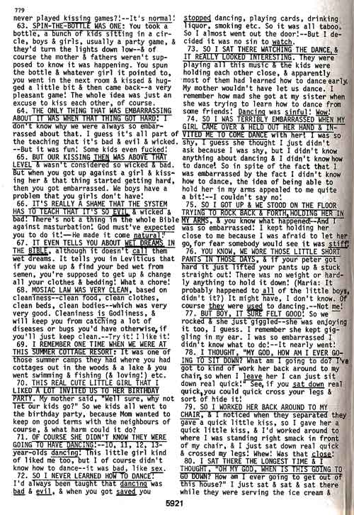 49 BUT THE TROUBLE WAS HE'D GONE & GOTTEN THE GOVERNESS & the cook & the gardener & all four of them were looking through the crack of the door! Here were these four heads watching us trying to make it! Oh me, I was so embarrassed!--& terrified! 50 WE WERE SO SCARED! I JUMPED UP & RAN OUT THE BACK DOOR! I don't know what happened to her--it was his little girl, by the way! I think I had only unbuttoned my pants & she pulled up her dress. Anyhow, I made a very rapid exit! 51 I WENT OUT & HID IN THE ATTIC OF THE HOUSE BEHIND, I was so scared he was going to give me a spanking! I hid in there for a long time, a couple hours. But nothing happened, nobody came calling my name or anything. So I sneaked down to my room & hid out until suppertime. 52 CAME SUPPERTIME & I HAD TO GO TO DINNER--the whole family always came to supper. My father sat at one end, my mother sat at the other end, & we kids all sat on this side & the cook & the gardener & all the rest of them sat on the other side--it was a big table. I usually sat down next to my mother, since I was the youngest & her favorite. 53 I WAITED AS LONG AS I COULD & came late to supper, & I kind of snuck in & got as close to my mother, as I could & hid. I don't know whether you've seen kids do that when they don't want to be seen. 54 I WAS AFRAID TO LOOK AT MY UNCLE OR ANYBODY. But he was kind of a jolly chap & he just looked over at me & kind of winked, but I was scared stiff he'd told my folks!--That would be the end! 55 BUT THEY NEVER SAID A WORD, SO I GUESS HE NEVER TOLD THEM, & I guess the rest of them didn't tell them either, thank the Lord! I was so glad I didn't get a spanking for that one! It's really amazing the attitude parents usually have toward children when it comes to sexual experimentation, like it was all evil! 56 SO I STARTED AT AN EARLY AGE & ENGAGED IN SEX ALL MY LIFE, but I don't think it's hurt me, thank the Lord! Maybe it was good for me. But I don't think all that prohibition was good for me & all that scaring me half to death & threatening to cut it off & terrifying me! 57 WELL AFTER AGE SEVEN, WHEN I FINALLY LEARNED HOW TO DO IT WITH MY LITTLE COUSIN, I WAS A CONFIRMED ADDICT! I used to do it quite frequently. I almost always woke up in the morning hard, which is natural for boys, so I would jack it off. Then when I was 12 years of age i began having semen. 58 I'LL TELL YOU ONE REASON WHY I WASN'T TOO SHOCKED ABOUT ANY OF THOSE THINGS: I was an avid reader & I found books about it, & i remember I read a lot about it. 59 IN MAGAZINES THEY'RE ALWAYS ADVERTISING THESE SEX BOOKS all about sex. So I was smart enough when I was as young as nine years old I wrote & ordered one of those books! They promised it would come in plain wrapper & all that stuff. It was full of pictures, & I read all about sex, the whole works! So I was well prepped at nine years of age what to expect at 12. 60 SO I WASN'T SURPRISED BY MY FIRST SEMINAL EXPERIENCE. I had read all about how when a little boy is 12 he'll start having semen, so I didn't freak out or have some kind of trauma thinking I was bleeding to death when my first semen came! 61 I KNEW EXACTLY WHAT WAS HAPPENING AND WHY IT WAS HAPPENING, so it didn't worry me. It was kind of a nuisance: from then on when I jacked off I always had to have some pare tissues or a handkerchief or something to catch it when there was no girl. 62 WE USED TO PLAY KISSING GAMES--that gets to be quite popular when you get to be about nine or ten or eleven. --Don't tell me you never played kissing games?!--It's normal! 63 SPIN THE BOTTLE WAS ONE: You took a bottle, a bunch of kids were sitting in a circle, boys & girls, usually a party game, & they'd turn the lights down low-- & of course the mother & fathers weren't supposed to know it was happening. You spun the bottle & whatever girl it pointed to, you went into the next room & hugged & kissed a little bit & then came back--a very pleasant game! The whole idea was just an excuse to kiss each other, of course. 64 THE ONLY THING EMBARRASSING ABOUT WAS WHEN THAT THING GOT HARD! I don't know why we were always so embarrassed about that. I guess it's a part of teaching that it's bad & evil & wicked.--But it was fun! Some kids even fucked! 65 BUT OUR KISSING THEN WAS ABOVE THAT LEVEL & wasn't considered so wicked & bad. But when you got up against a girl & kissing her and that thing started getting hard, then you got embarrassed. We boys have a problem that you girls don't have! 66 IT'S REALLY A SHAME THAT THE SYSTEM HAS TO TEACH THAT IT'S SO EVIL & wicked & bad. There's not a thing in the whole Bible against masturbation! God must've expected you to do it. He made it come natural! 67 IT EVEN TELLS YOU ABOUT WET DREAMS IN THE BIBLE, although it doesn't call them wet dreams. It tells you in Leviticus that if you wake up & find your bed wet from semen, you're supposed to get up & change all your clothes & bedding! What a chore! 68 MOSAIC LAW WAS VERY CLEAN, based on cleanliness--clean food, clean clothes, clean beds, clean bodies--which was very, very good. Cleanliness is Godliness, & will keep you from catching a lot of diseases or bugs you'd have otherwise, if you'll just keep clean.--Try it! I like it! 69 I REMEMBER ONE TIME WHEN WE WERE AT THIS SUMMER COTTAGE RESORT: It was one of those summer camps they had where you had cottages out in the woods & a lake & you went swimming & fishing (& loving! ) etc. 70 THIS REAL CUTE GIRL THAT I LIKED A LOT INVITED US TO HER BIRTHDAY PARTY. My mother said, "Well sure why not let our kids go?" So we kids all went to the birthday party, because mom wanted to keep on good terms with the neighbors of course, & what harm could it do? 71 OF COURSE SHE DIDN'T KNOW THEY WERE GOING TO HAVE DANCING! --10, 11, 12, 13-year-olds dancing! This little girl kind of liked me too, but of course I didn't know how to dance--it was bad, like sex. 72 SO I NEVER LEARNED HOW TO DANCE! I'd always been taught that dancing was bad & evil, & when yo
